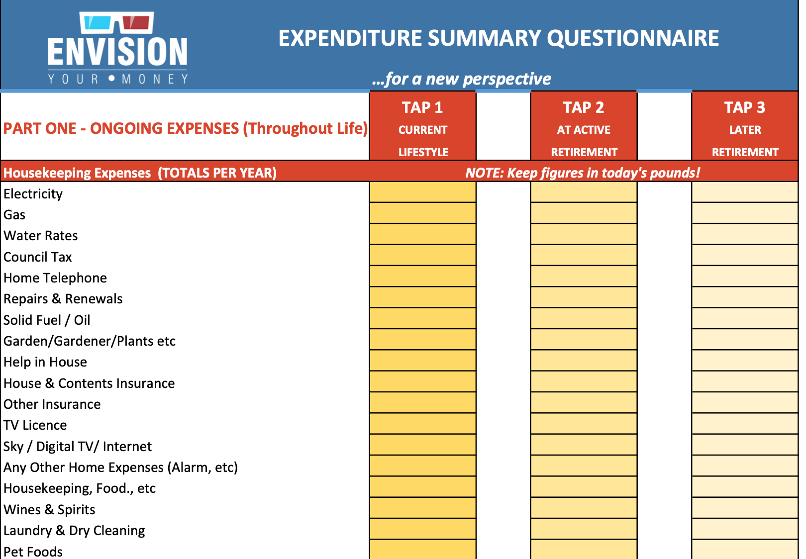 Use this spreadsheet to total up your expenditure requirements at various stages of your life. (Taps 1, 2 & 3).
